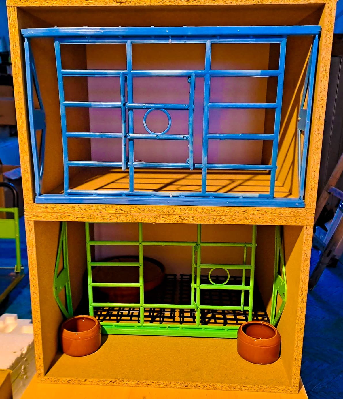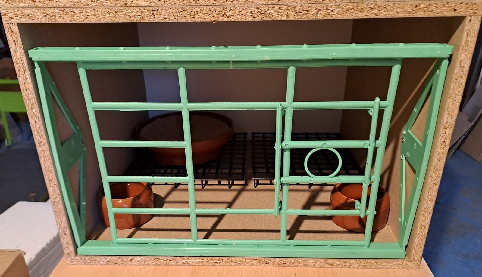 Fata boxa rotativa pentru porumbei prevazuta cu usita culisanta si orificii pentru prindere in boxa
